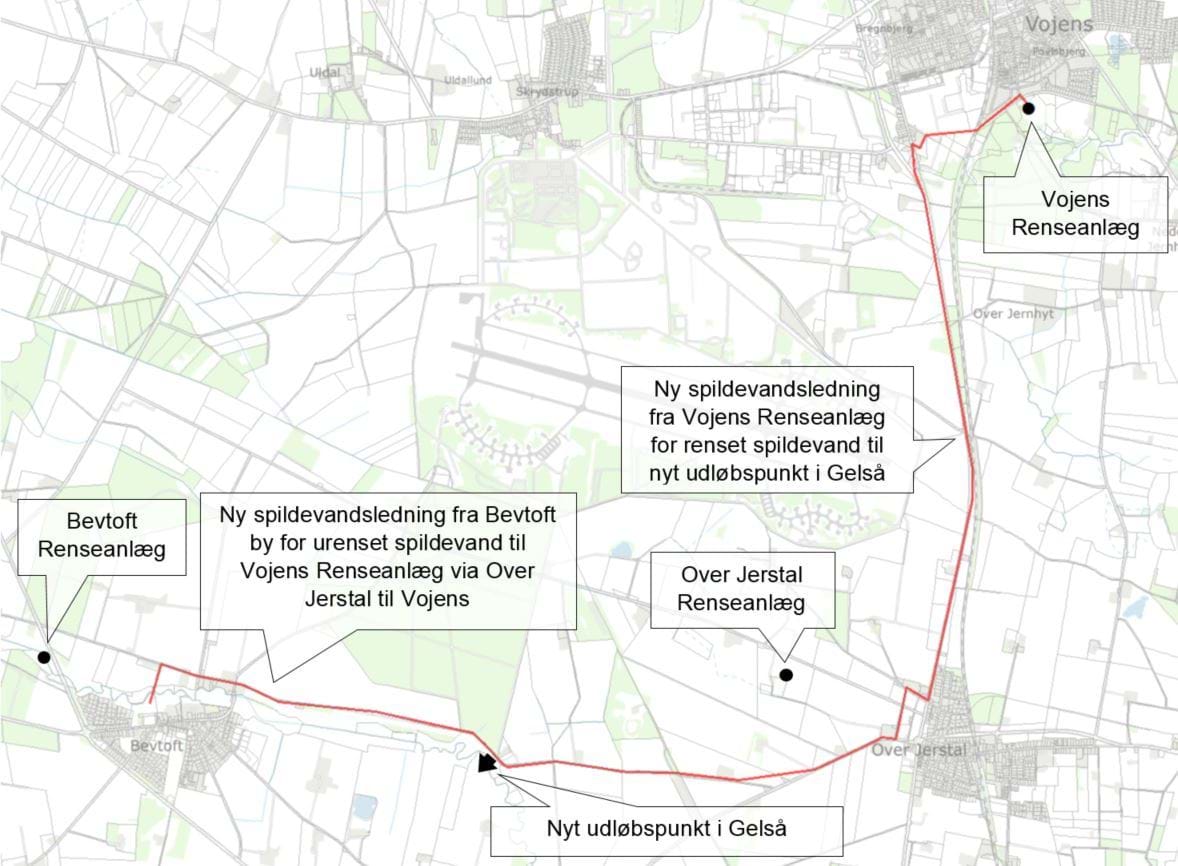 - der lægges en ny spildevandsledning fra Bevtoft via Over Jerstal til Vojens renseanlæg,