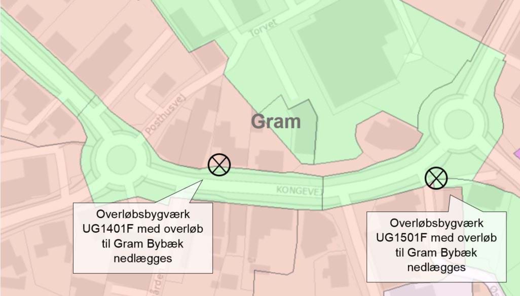 I forbindelse med anlæggelse af den nye hovedregnvandskloakledning fra Gram midtby til Gram renseanlæg og jævnfør udledningstilladelsen til denne, skal overløbsbygværkerne UG1401F og UG1501F nedlægges.