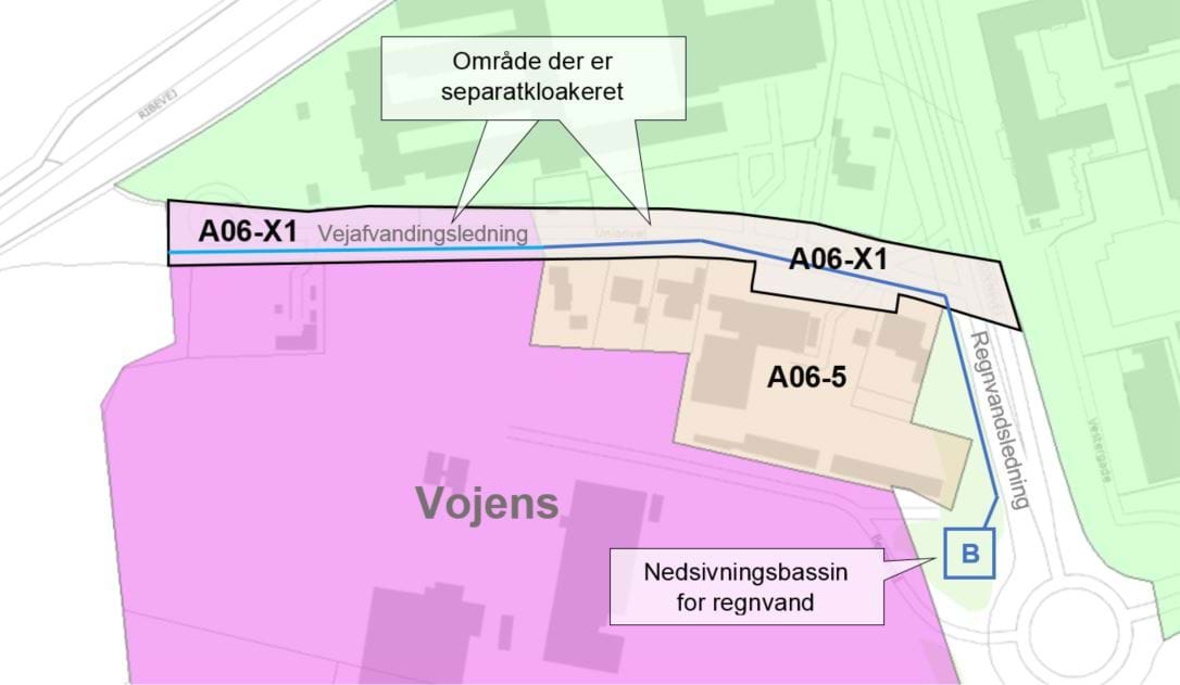 Planen er at overdrage regnvandsledningen i opland A06-X1 og nedsivningsbassinet (B) til Provas.