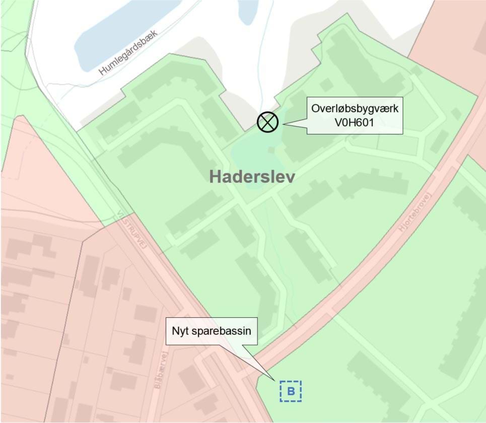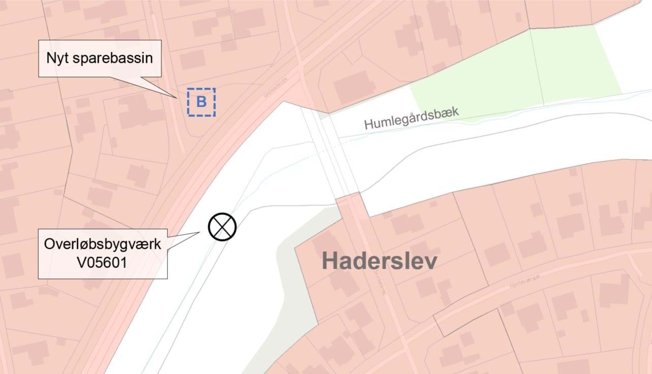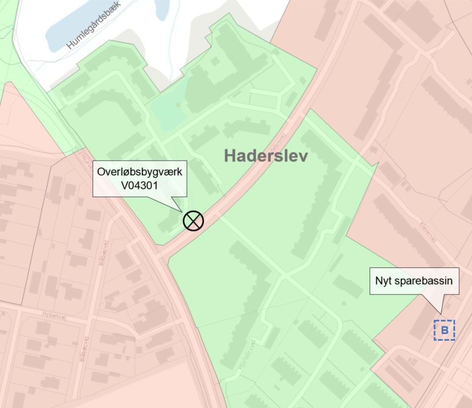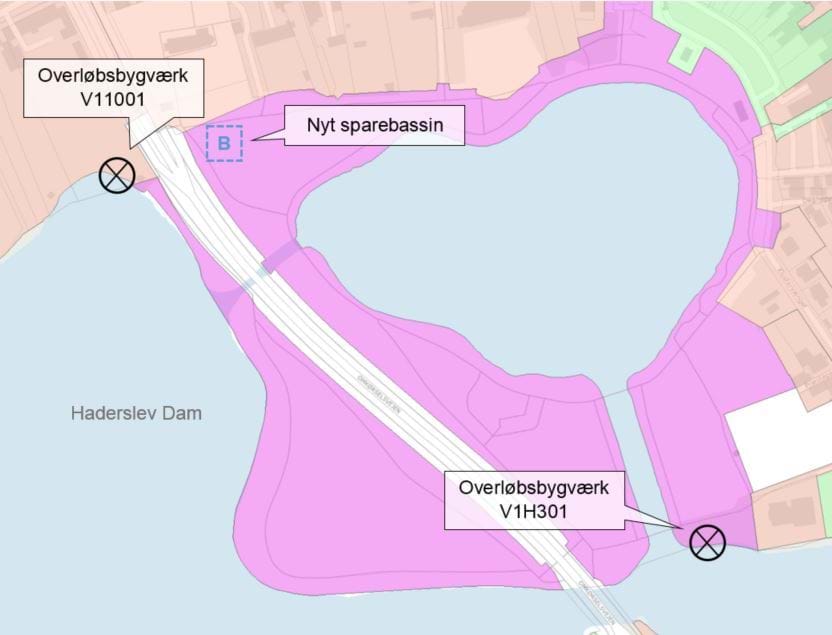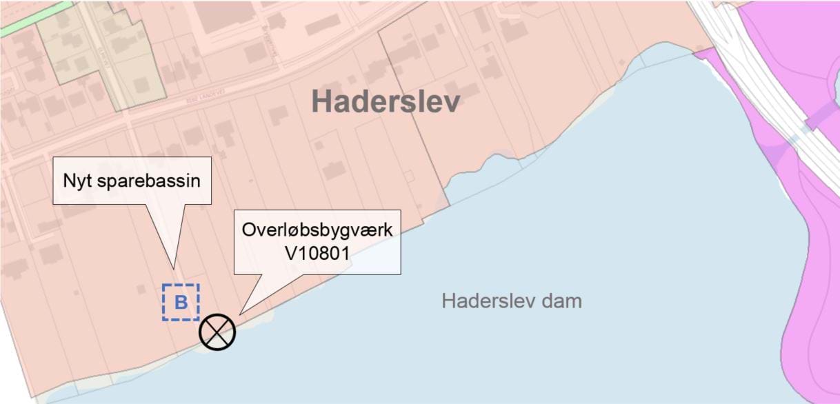 Sparebassin langs Haderslev dam, etableres ved overløbsbygværk V10801. Sparebassinet vil reducere antal overløb med aflastning.