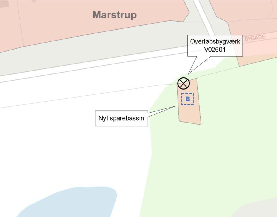 Sparebassin ved Marstrup Bæk, etableres ved overløbsbygværk V02601. Sparebassinet vil reducere antal overløb med opspædet spildevand.