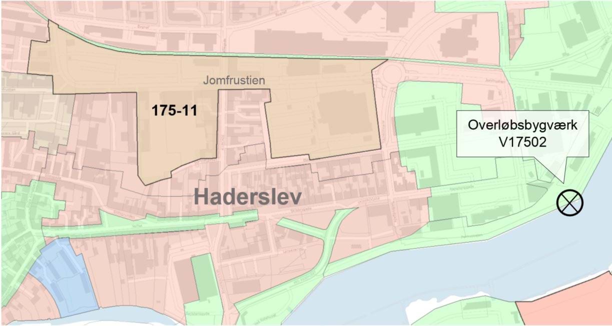 Overløbsbygværket V11001 har aflastning af opspædet spildevand fra kloaknettet til Haderslev dam.