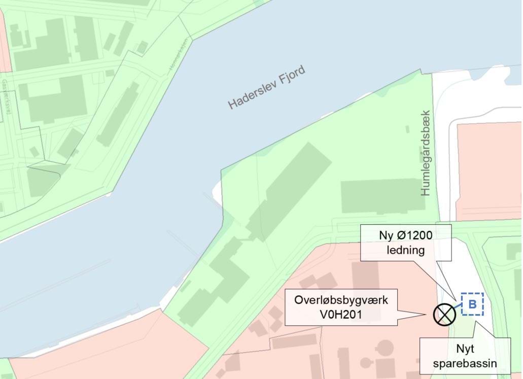 Udløbspunktet fra sparebassinet planlægges samtidig flyttet fra Humlegårdsbæk til Haderslev fjord. Dette afklares endeligt ved detailprojektering.