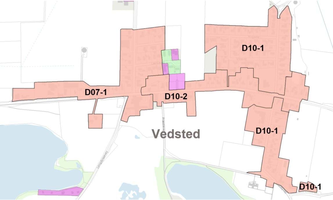 I Vedsted er de fælles kloakerede oplande D07-1, D10-1, D10-2 (de grønne på kortet) i spildevandsplan 2014-2020 udlagt for separatkloakering.